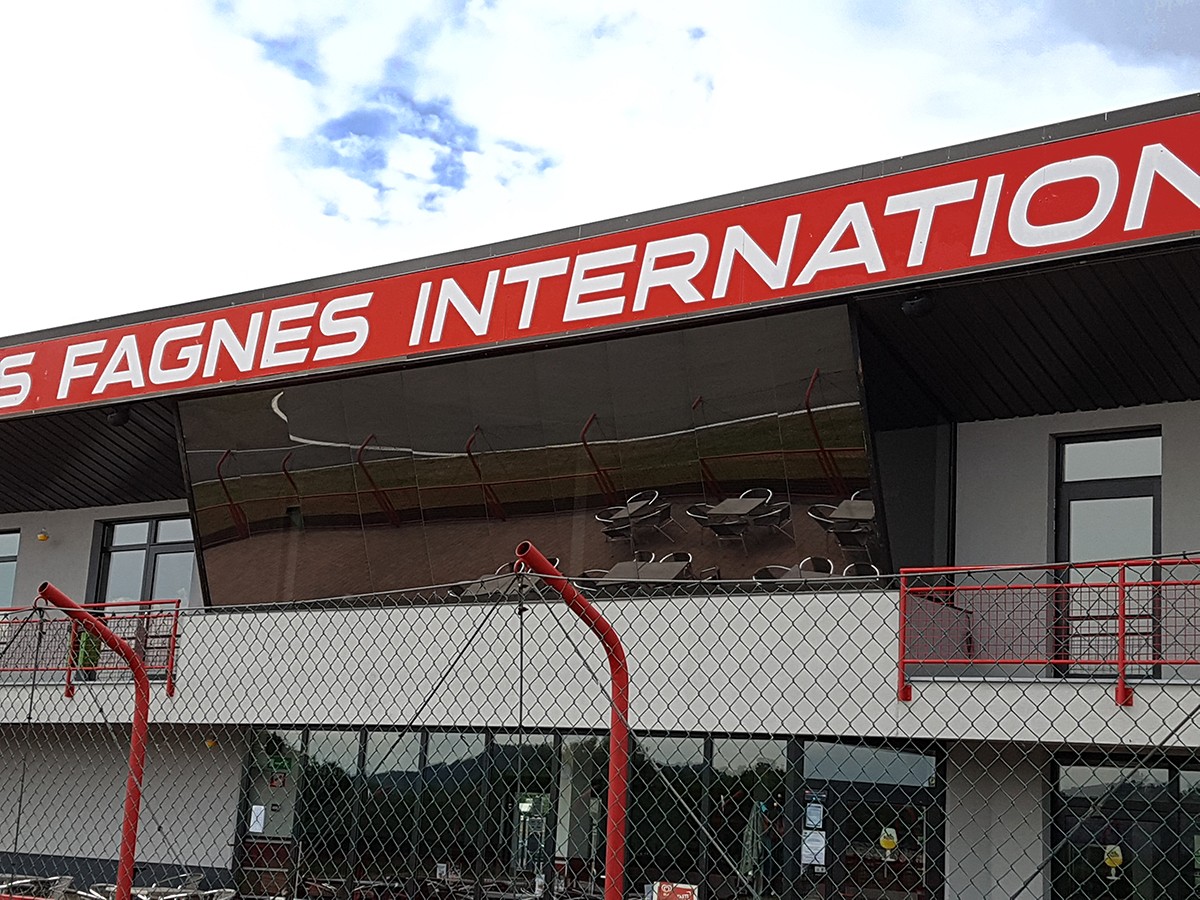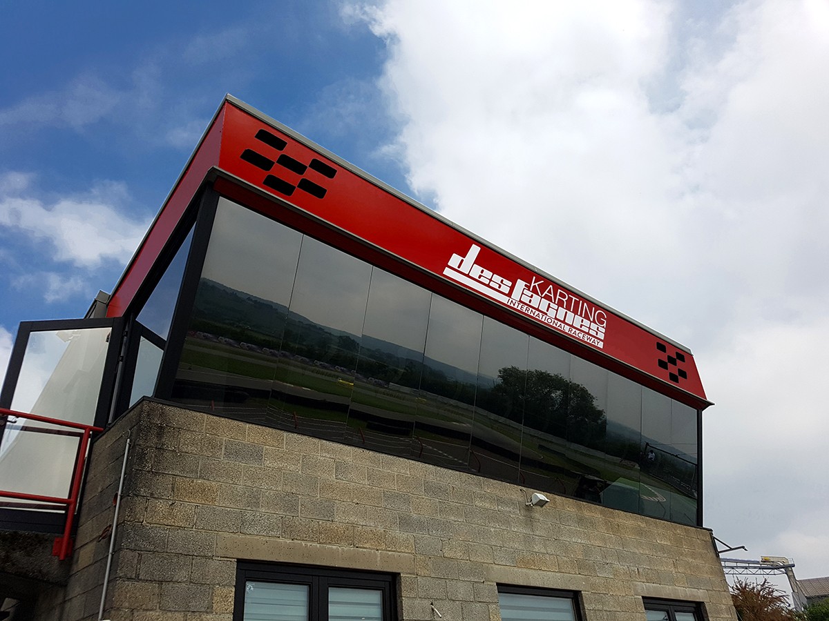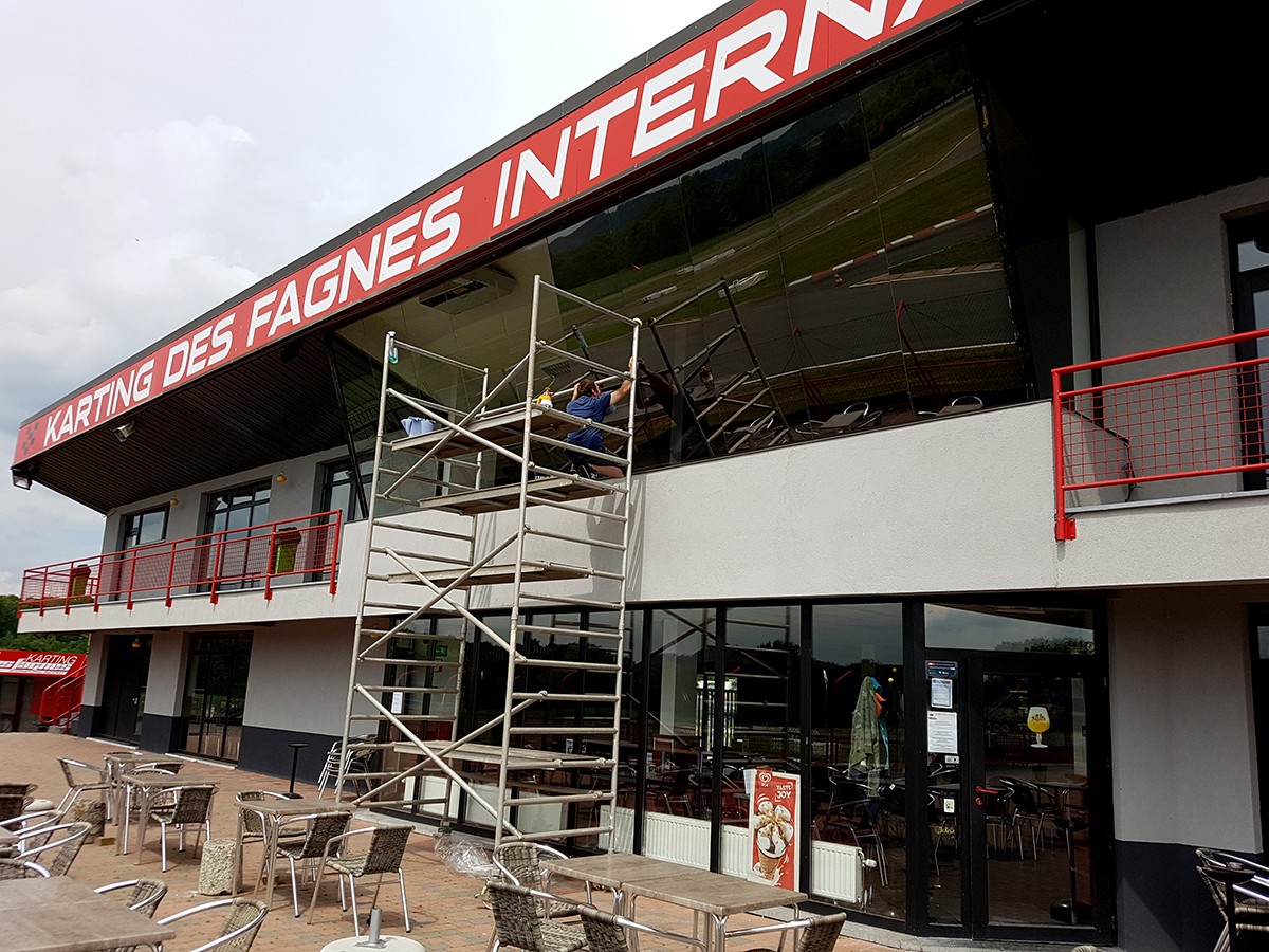 Application de films solaires sur vitres au Karting des Fagnes à Mariembourg. Objectif : limiter la température interne.