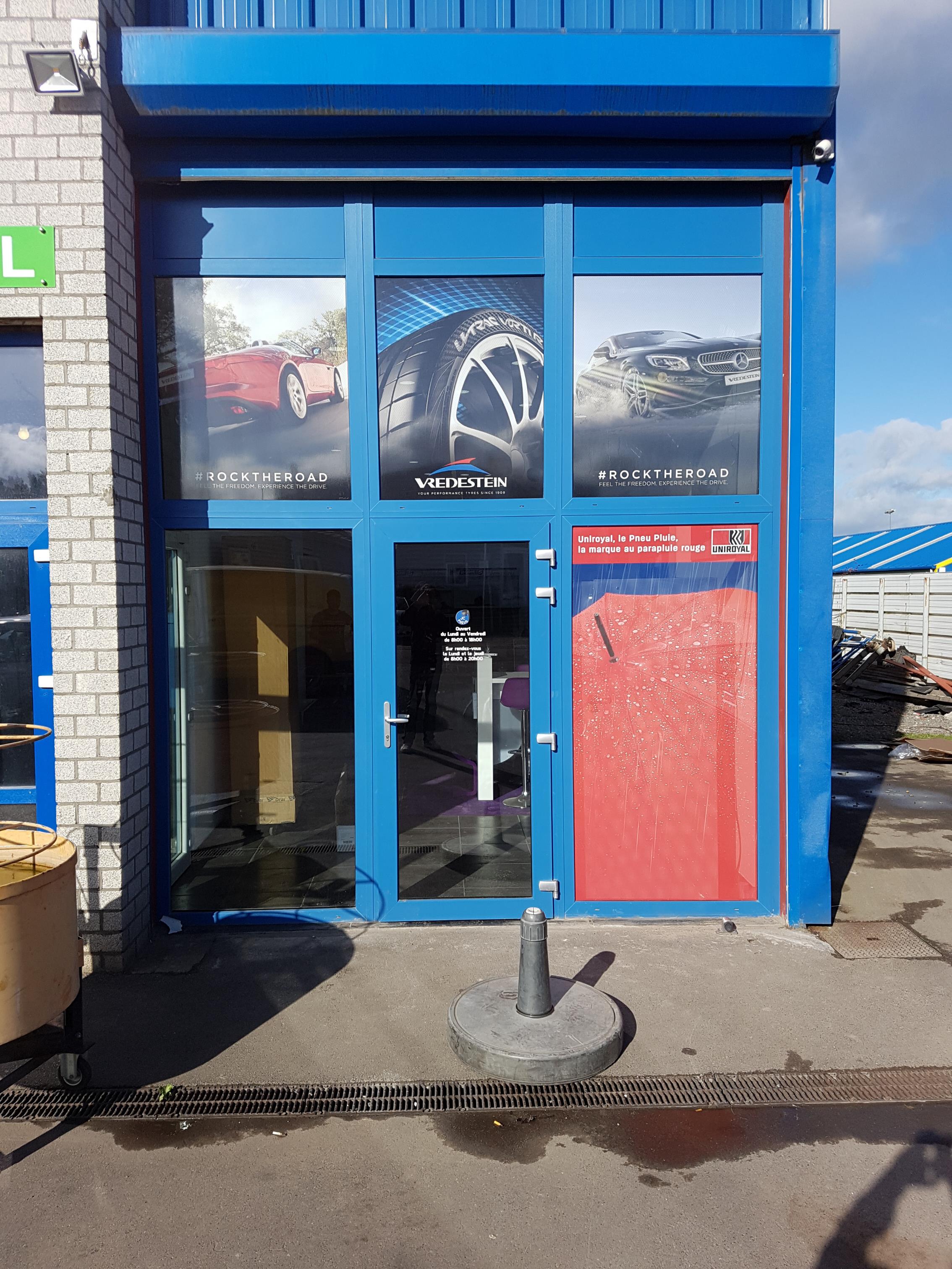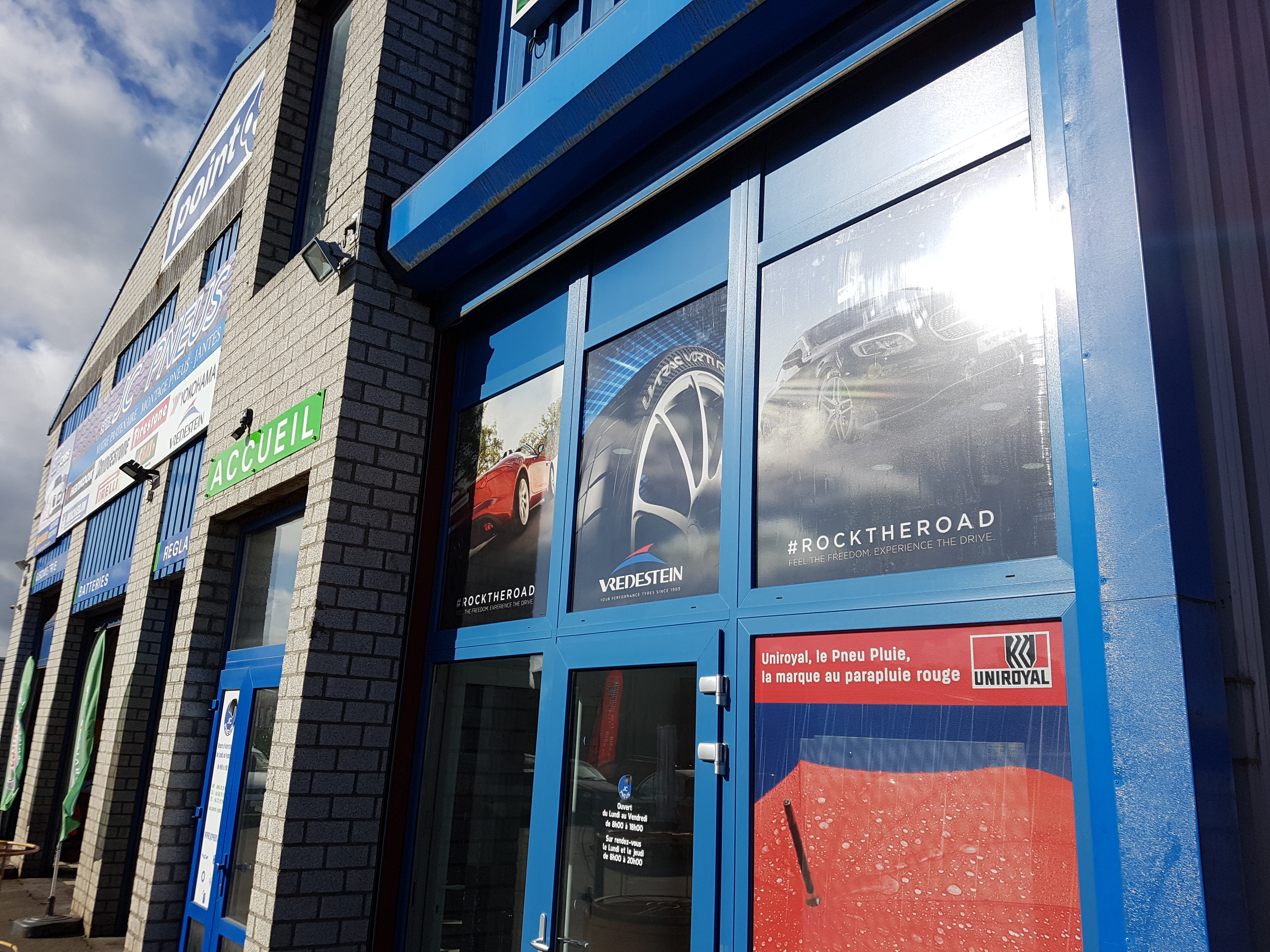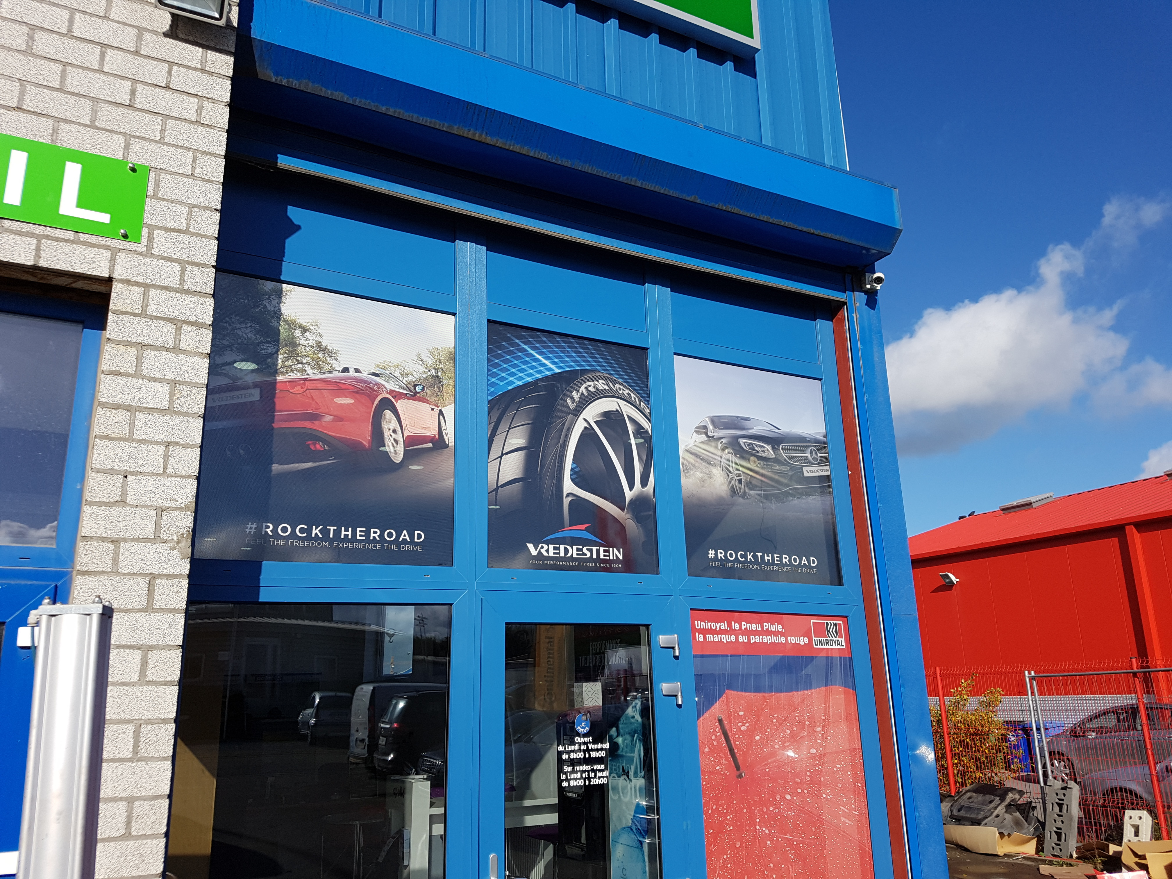 Pose d'un vinyle micro-perforé sur la vitrine d'un commerce en région liégeoise.