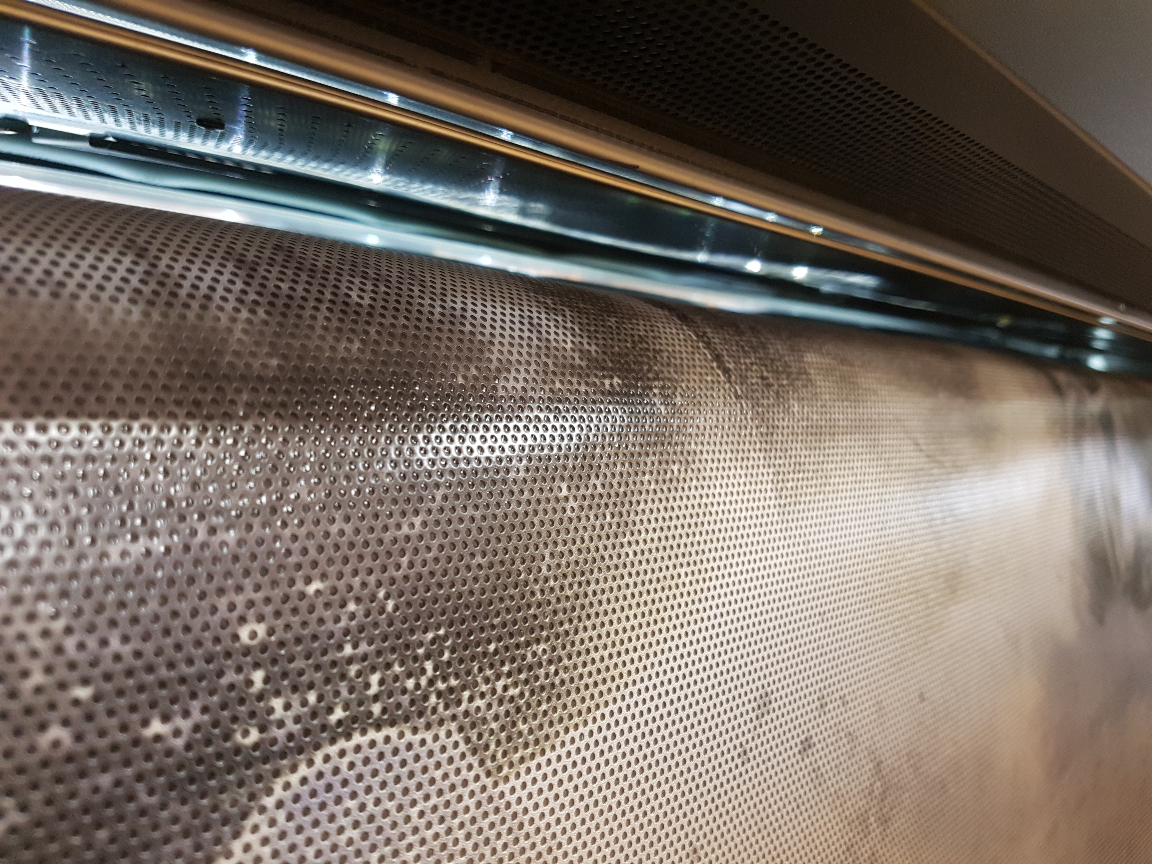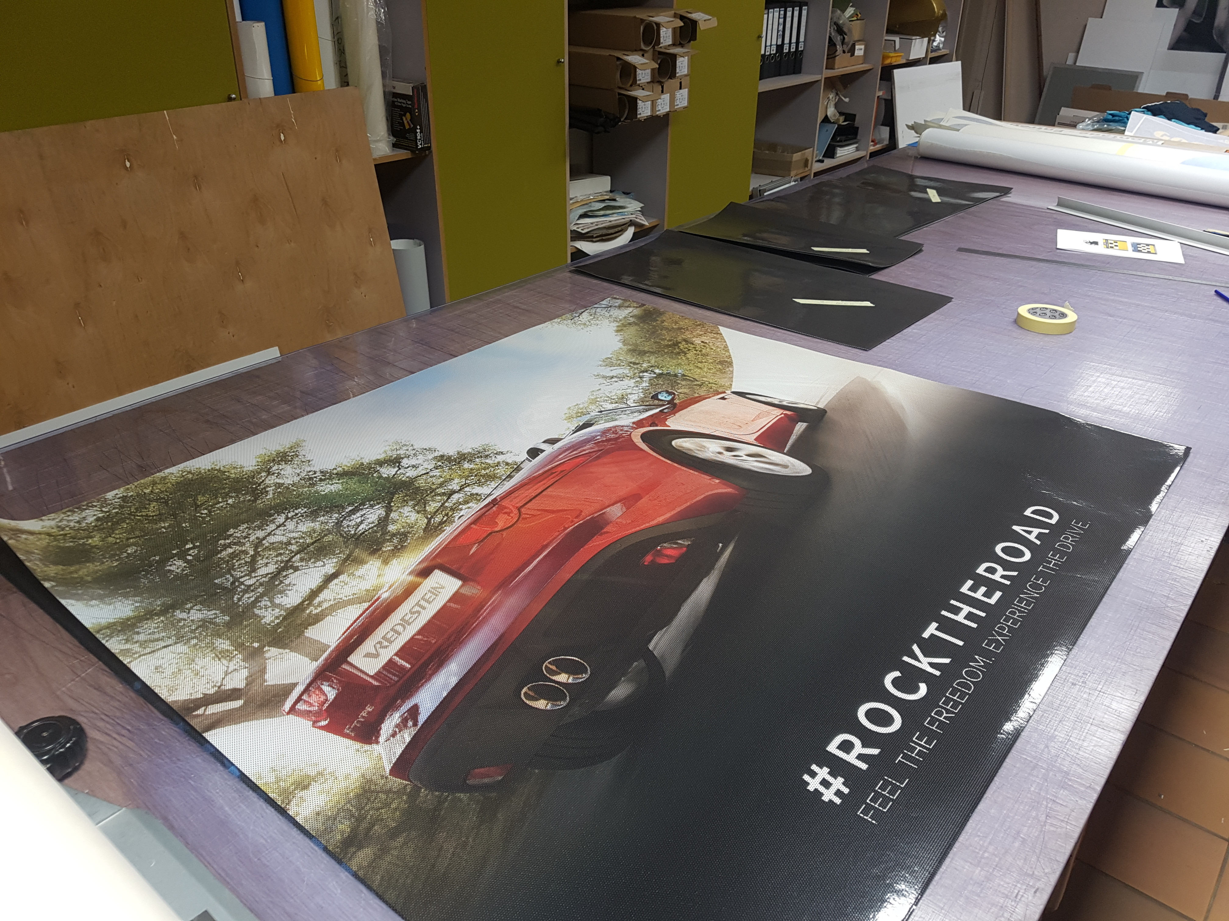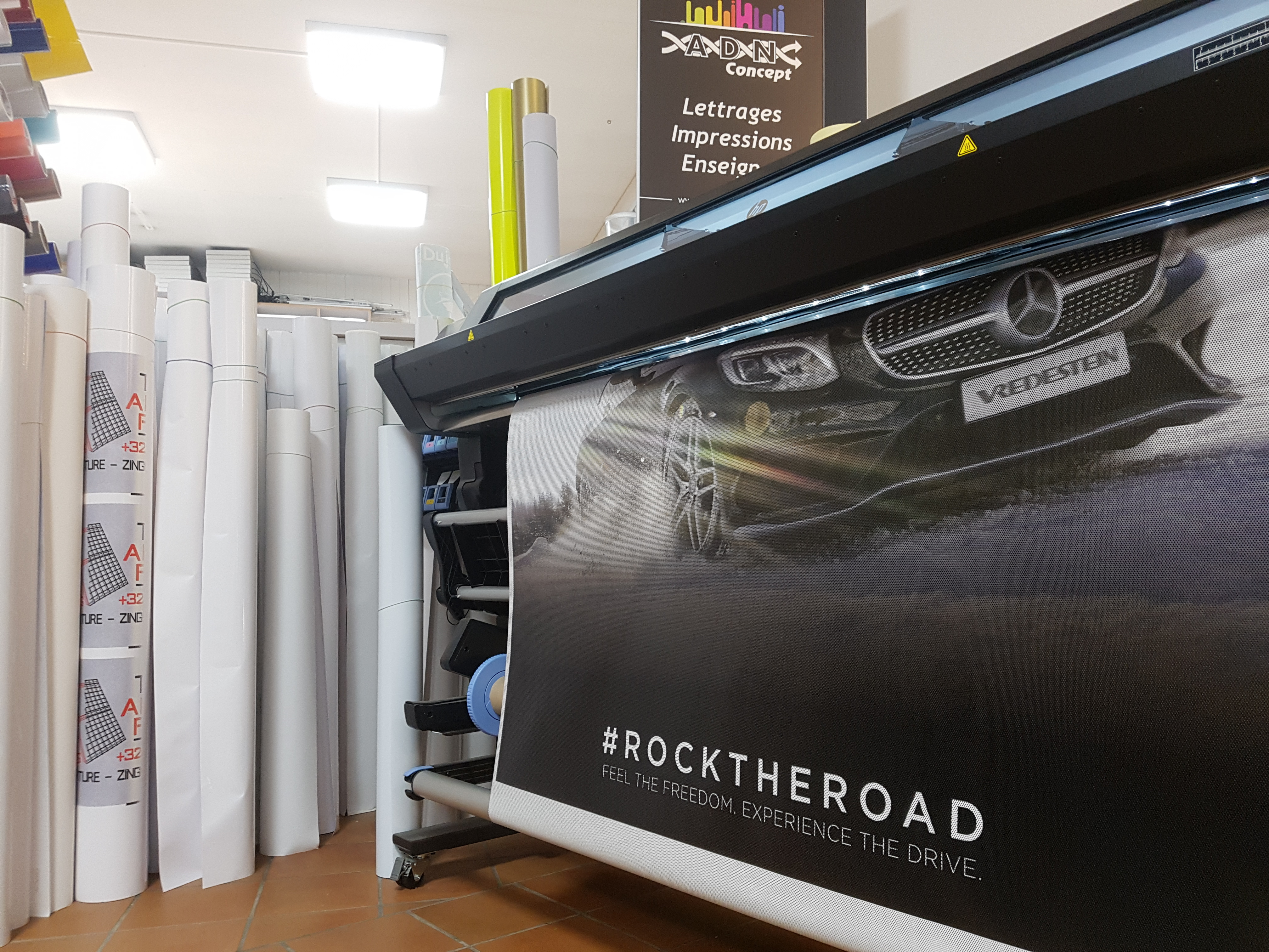 Pose d'un vinyle micro-perforé sur la vitrine d'un commerce en région liégeoise.